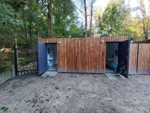 Mobilní WC a úpravna vody na splachování u jezírka, dole monitoring kvality vody u výpustí.